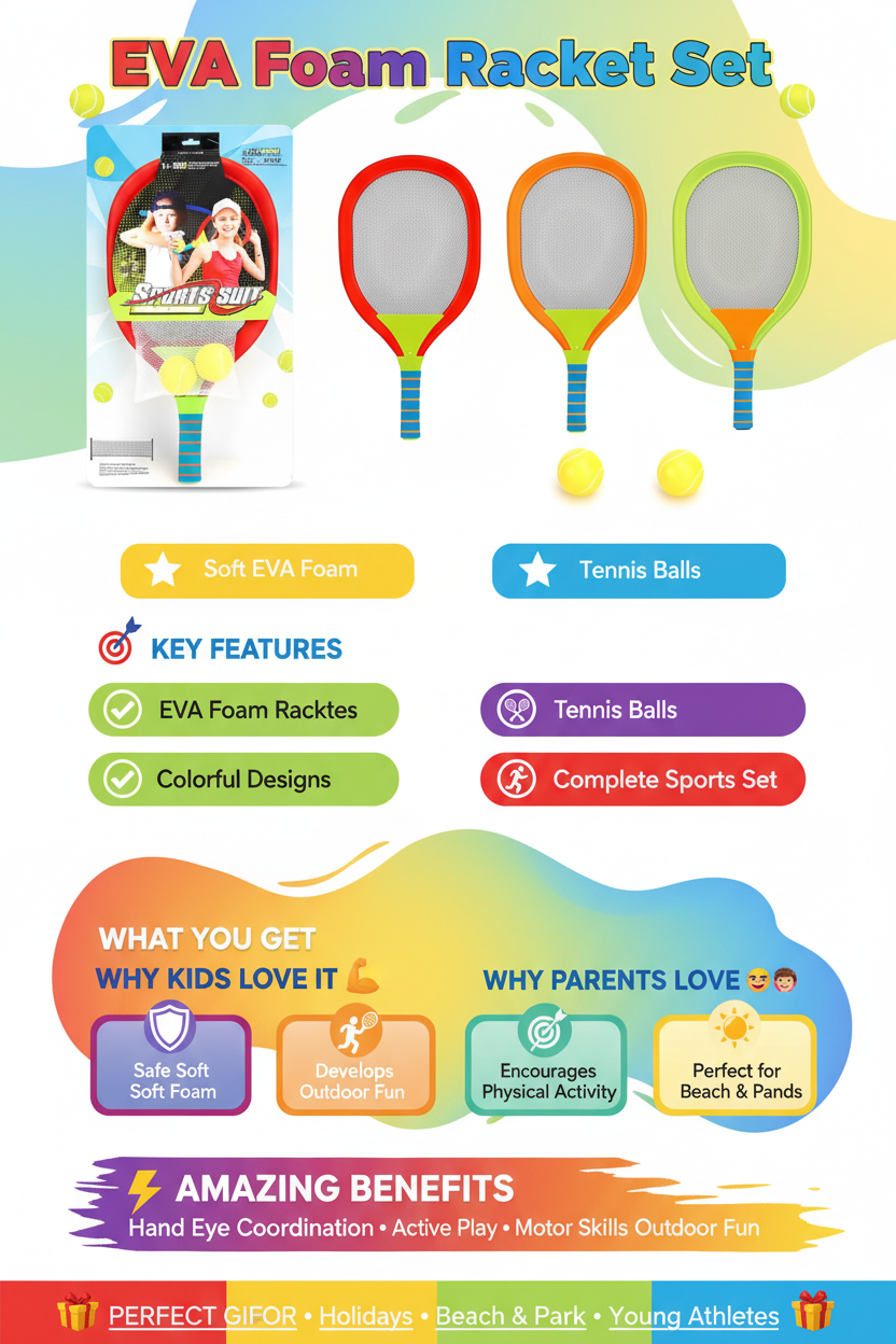 Safe sports fun for little ones! These colorful EVA foam rackets are perfect for young children learning tennis. Soft, lightweight, and safe with bright colors that kids love. Great for beach, park, or backyard play!