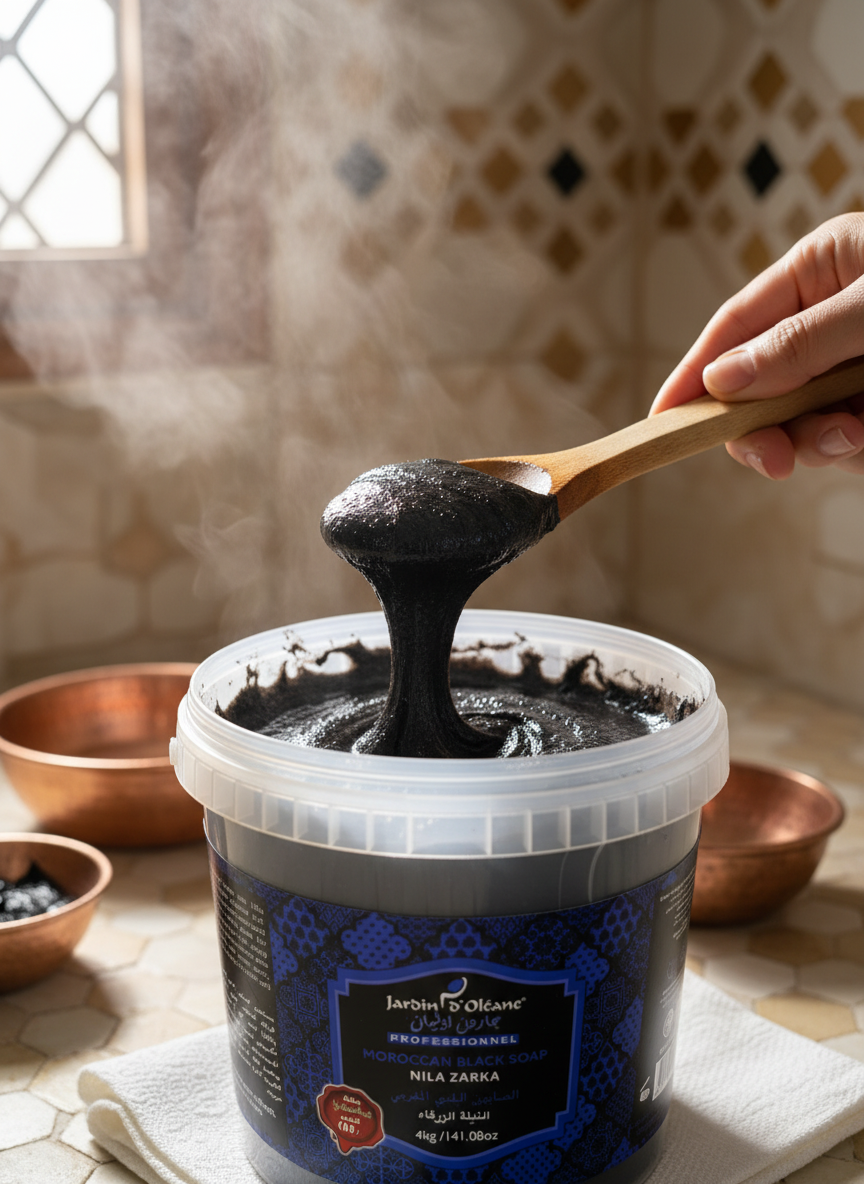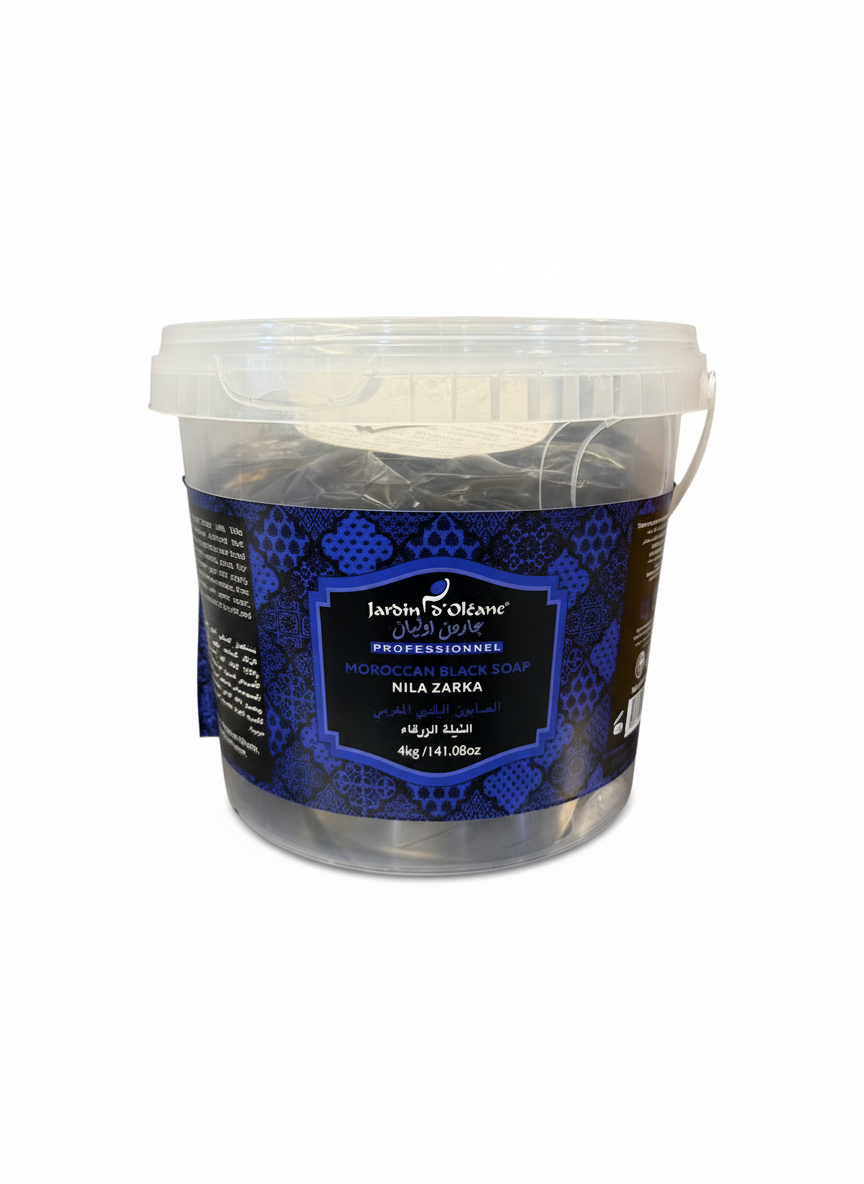Discover the ultimate purifying experience with Jardin d'Oleane Professional Moroccan Black Soap with Nila Zarka. This 4kg professional bucket combines traditional Savon Beldi with legendary blue clay for a hammam treatment that cleanses, purifies, and brightens like nothing else.