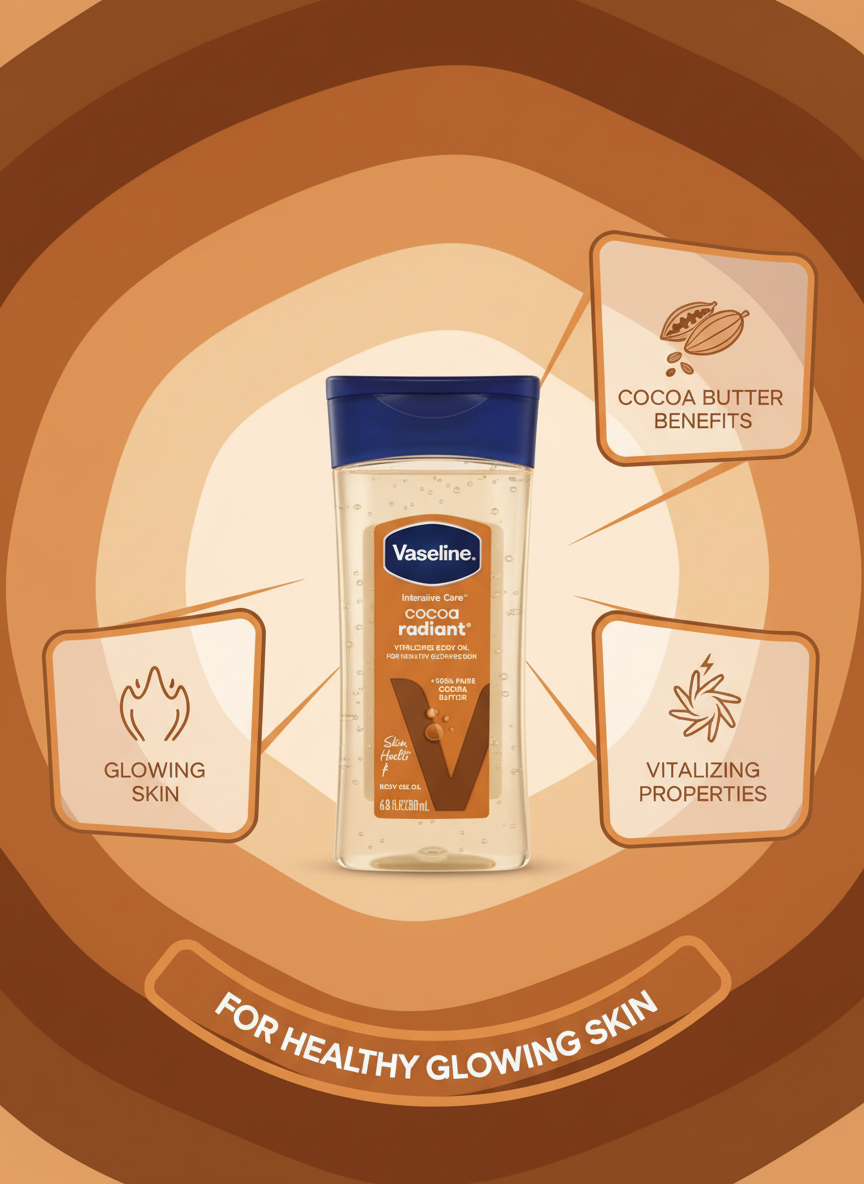 Experience the transformative power of Vaseline Cocoa Radiant—a vitalizing body gel oil enriched with 100% pure cocoa butter. This luxurious formula doesn't just moisturize; it revitalizes tired, dull skin, revealing your natural, healthy glow.