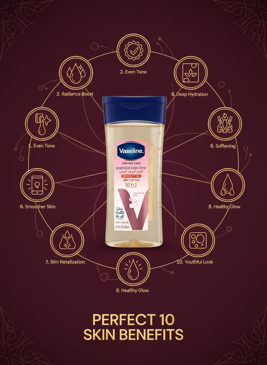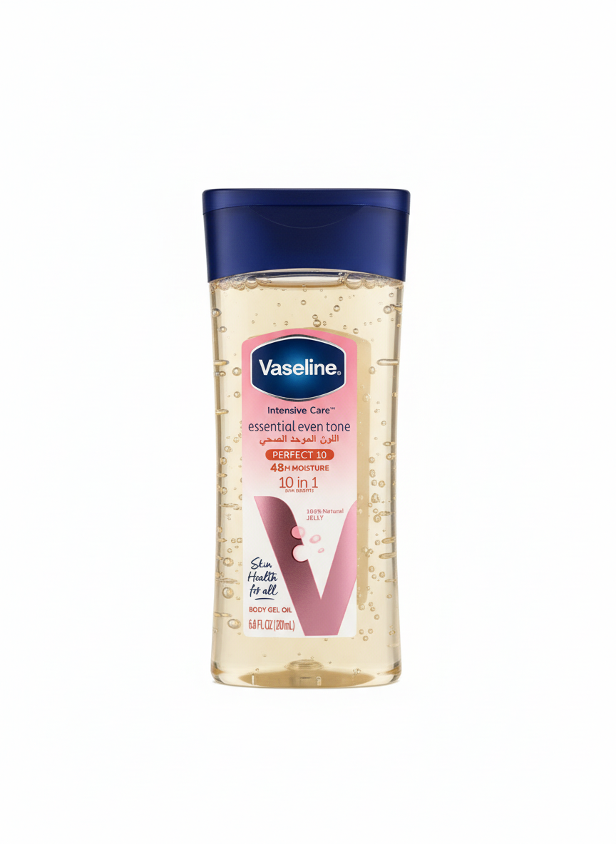 Why settle for less when you can have it all? Vaseline Essential Even Tone Perfect 10 delivers ten essential skin benefits in one revolutionary body gel oil. It's the ultimate all-in-one solution for flawless, even-toned, perfectly moisturized skin.