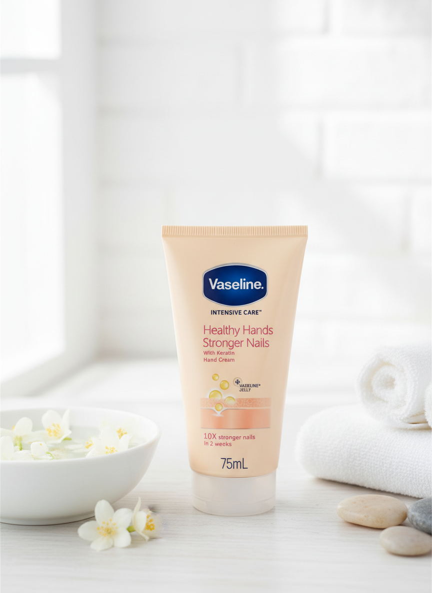 Vaseline Intensive Care Healthy Hands Stronger Nails hand cream is clinically proven to deliver 10x stronger nails in just 2 weeks. Enriched with keratin and Vaseline Jelly, this powerful formula transforms weak, brittle nails while keeping hands soft and moisturized.