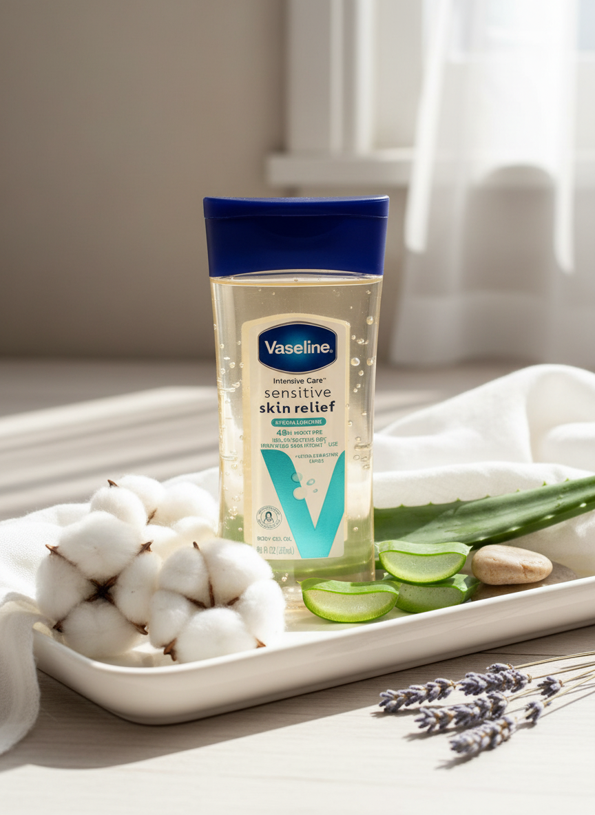Vaseline Sensitive Skin Relief Body Gel Oil is specially formulated for delicate, reactive skin. This hypoallergenic formula with micro-droplets of Vaseline Jelly heals and soothes dry, irritated skin from the very first application—providing 48 hours of continuous relief.